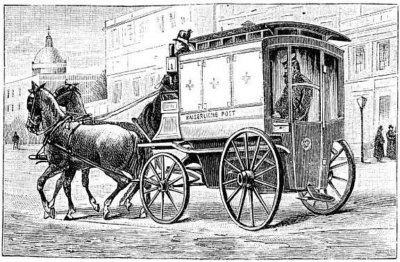 mit der Post, an eine Postkutsche, die mit einem